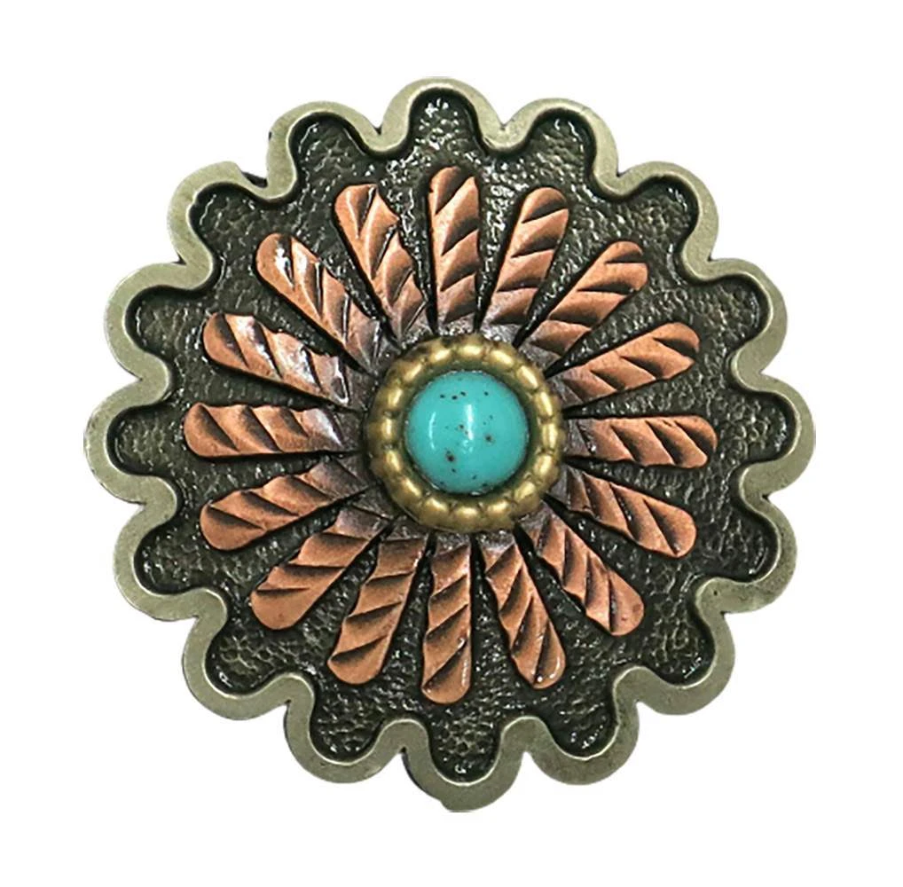 Augus Silversmith’s Turquoise Copper Rossette 6pc Saddle Concho Set consists of top-of-the-line metal bases and crafted by some of the best silversmith artists in the world. Each concho design is created to reflect the passion and spirit. The saddle concho set comes standard with 4 1 1/2in and 2 1in conchos. Six Chicago screws and six wood screws are also included for easy and convenient replacement on your headstalls, breast collars, and saddles! AS-AB6-SET