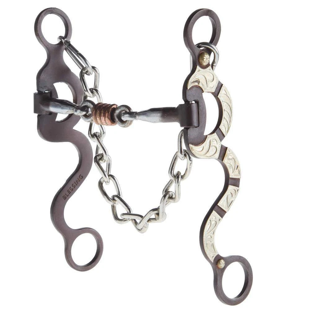 New to NRS is the Tommy Blessing 8″ Cheek with dogbone and roller mouthpiece. This bit features the same great antique finish, but with the new silver bars/floral overlay shank design.