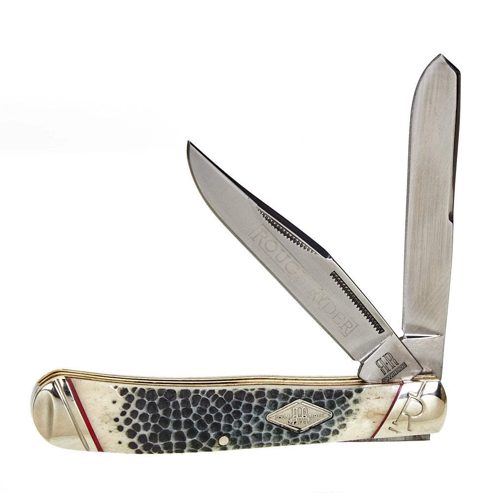 Many uses for this multi purpose tool. This trapper folding pocket knife with buckshot bone handle is 4.13 inches when closed. The clip and spey blades are a stainless steel mirror finsih. The bone handle also has inlay shield and bolster(s).ย Made in China. Model:ย RR1544