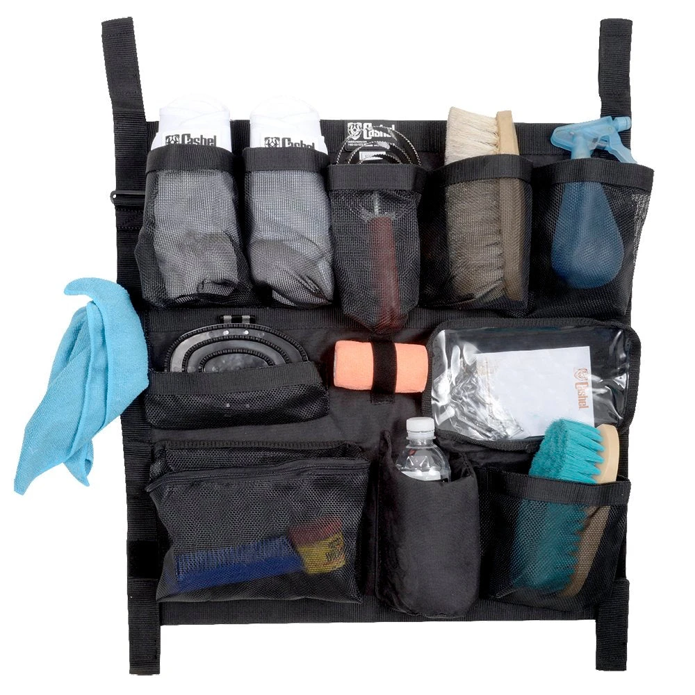 The ultimate tool for organizing your barn or trailer. Different sized pockets maximize convenience and optimize space. Items stay in pockets due to the special square bottom design. The unique removable zippered pocket on the half and full versions is great for show and health papers during check-in. Mounting hardware included with double S closure for added security when hanging.