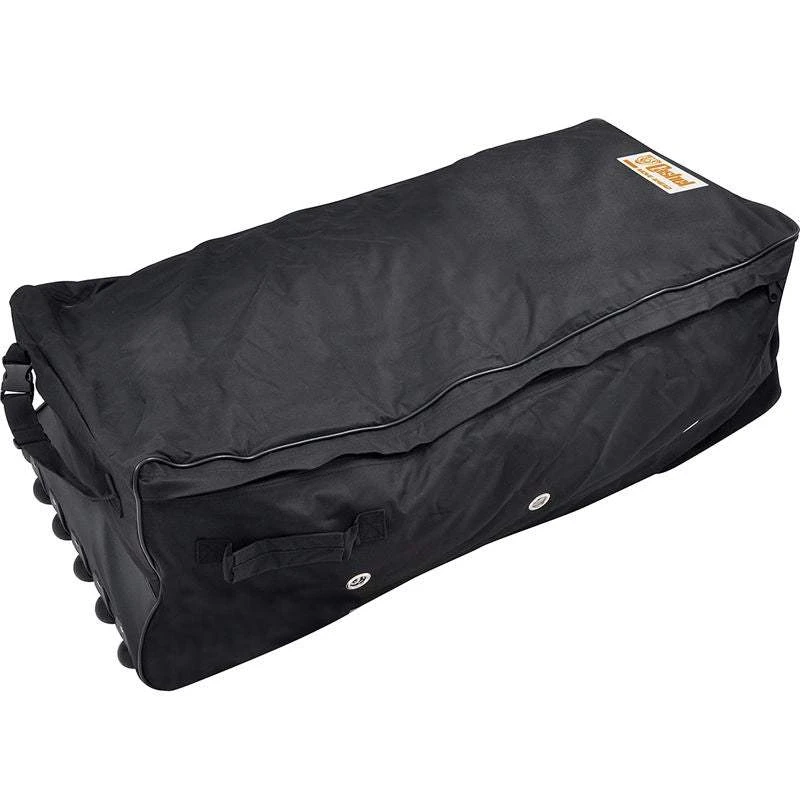 Made of tough, water resistant nylon, with two sizes to fit a two strand or three strand hay bale. Heavy duty zipper on three sides for easy loading. Also, heavy duty plastic wheels and nylon handle provide easy transport. Convenient side handles for loading in the truck. 44″ x 18″ x 15″