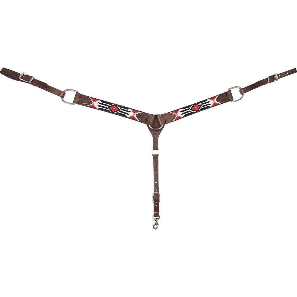 The Cashel Taos breast collar is made of chocolate skirting leather with red/black beaded accents and 2″ wide.
