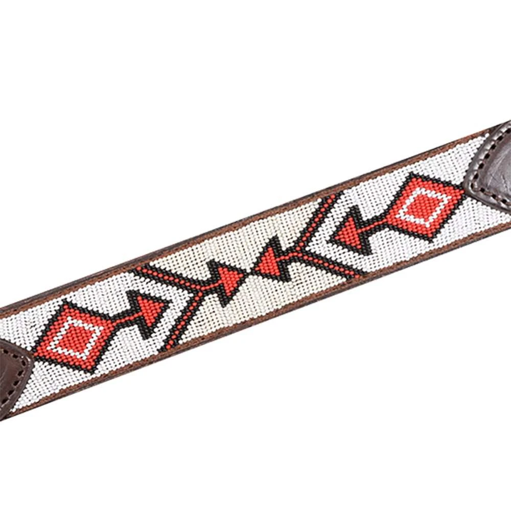 The Cashel breast collar is made of chocolate skirting leather with white/red beaded accents and 2″ wide.
