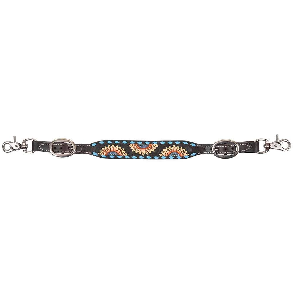 This Circle Y Sunflower Buckstitch Wither Strap is beautifully designed and crafted with hand tooled and painted sunflowers on dark leather accented with turquoise buckstitching. Stainless steel hardware for durability. 1-1/4″ wide.