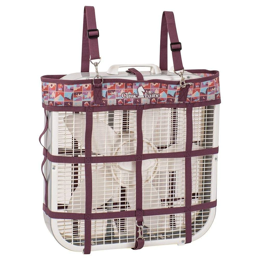 The Classic Equine Fan Bag is your new travel companion! Secures a standards 20″x20″ box fan to the stall. Sturdy nylon webbing resists horseplay. Lightweight and portable. Space saving design.