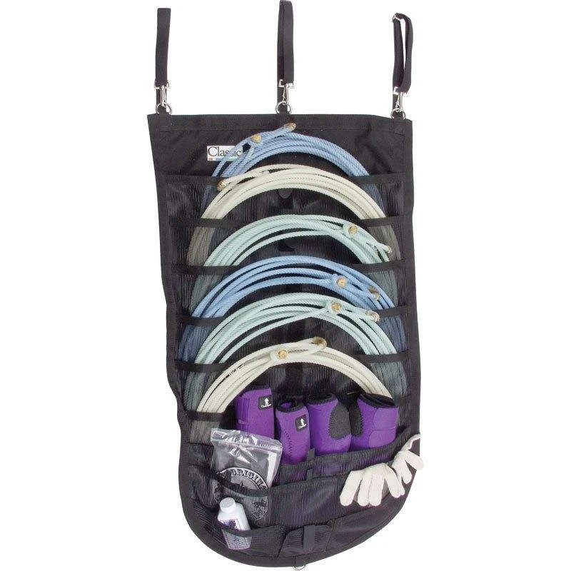 With a tough PVC mesh front, 600 denier poly back, and three nylon straps with buckles and rings, you can hang the Classic Ropes Hanging Rope Organizer anywhere from a trailer or tack room door to the arena fence. Each of the six compartments holds up to three ropes, and the seven smaller compartments hold gloves, powder, boots, etc. Measures 42 inches X 24 inches and is available in black. In 1986 in Granbury, Texas, Classic Rope started as one of the first companies to devise and perfect machine manufacturing of the lariat rope. Countless hours were spent formulating rope components that could withstand all types of roping conditions, both indoor and outdoor. Initially founded for the sole purpose of supporting the event of team roping, Classic was able to offer a consistent structure and sensitive feel in their ropes like no others on the market. Because of its quality and appeal, Classic Rope quickly became the leading rope manufacturer that professionals grew to depend on, and still use and trust today.