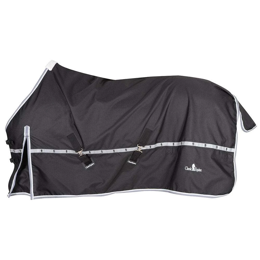 1200 Denier breathable ripstop outer shell is waterproof and extremely durable. This sheet is ideal for milder fall weather, with nylon lining that polishes the coat. Contoured design helps keep blanket stationary while eliminating pressure points. Fitted shoulder darts and fleece lining eliminate rubbing. Nylon straps are replaceable, to greatly extend blanket life. Waterproof seam tape and rear tail flap provide superior protection against wind and rain. Reflective Knight Vision™ safety strip maximizes visibility in low light. The attached hood stays flush on the neck with adjustable hook and loop straps.