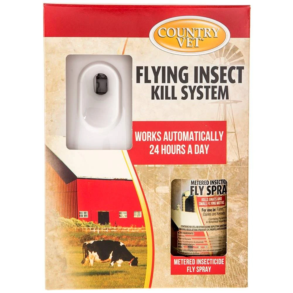 Country Vet Fly Spray Kit โ Kills gnats and small flying moths. Easy-to-program automatic dispenser features modern design and industry-leading battery life. Metered valve activated every 15 minutes; effectiveness usually noticeable within 1 hour after activation.