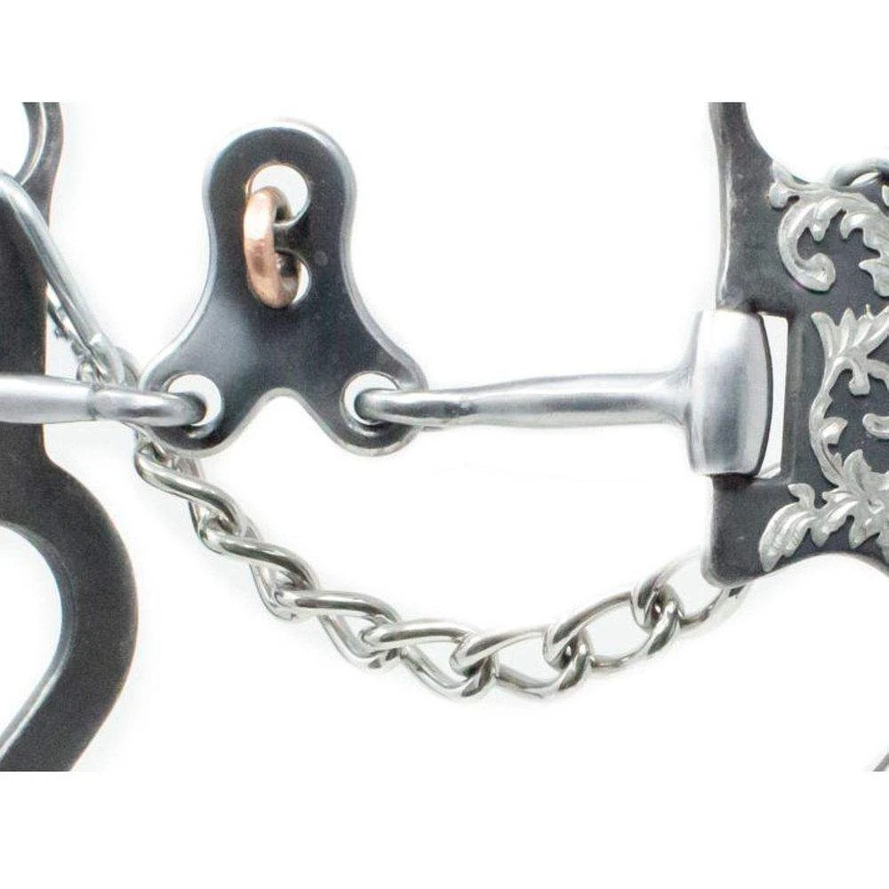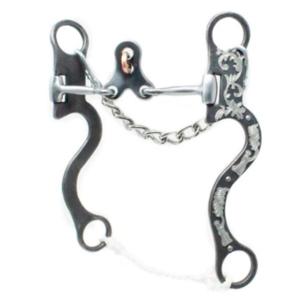 Ride like a legend with the Walt Woodard Legend Collection shank bits! These bits boast a timeless floral design on sleek dark grey steel shanks. The Walt Woodard Legend Collection Douglas Spade Roller Long Shank Bit features smooth snaffle bars and a douglas spade with a copper rolelr. The mouthpiece measures 5 1/8 inches wide and comes with a chain curb strap. Expertly crafted with a classic floral trim on the shank, this bit is both functional and stylish in the arena. Whether you’re training, doing day work, or competing, this bit is a great choice. Its product number is 611W13.