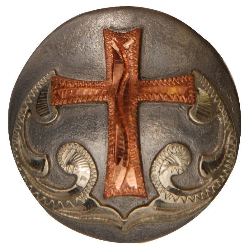You’ll love to embellish your tack with this beautiful 1-1/2″ Copper Cross Silver Floral Concho. 1-1/2 Copper Cross Silver Floral Concho1-1/2 Silver mounted copper Cross and German Silver floral engraved chicago screw concho.
