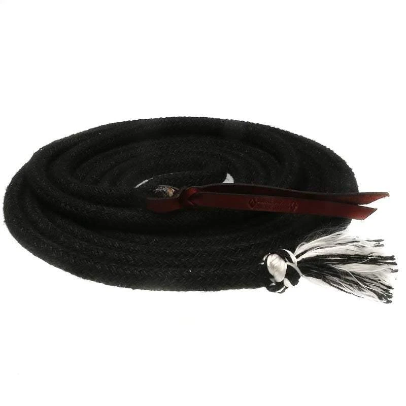 Double Diamond yacht braid mecate with a 9/16″ diameter and 22′ length. Featuring a turk’s head knot and leather popper. This rope has good weight, a fuzzy textured feel and great durability.