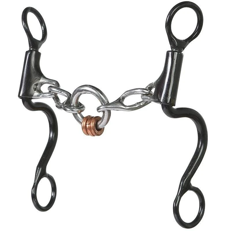 ย ย This three piece mouth with the 1 1/2″ Donut Ring allows for tongue pressure that encourages flex at the poll and adds headset and collection. It also increases lateral and vertical flexion. The chain mouth has the back twisted chain which provides equal pressure and release on both sides of the mouth.