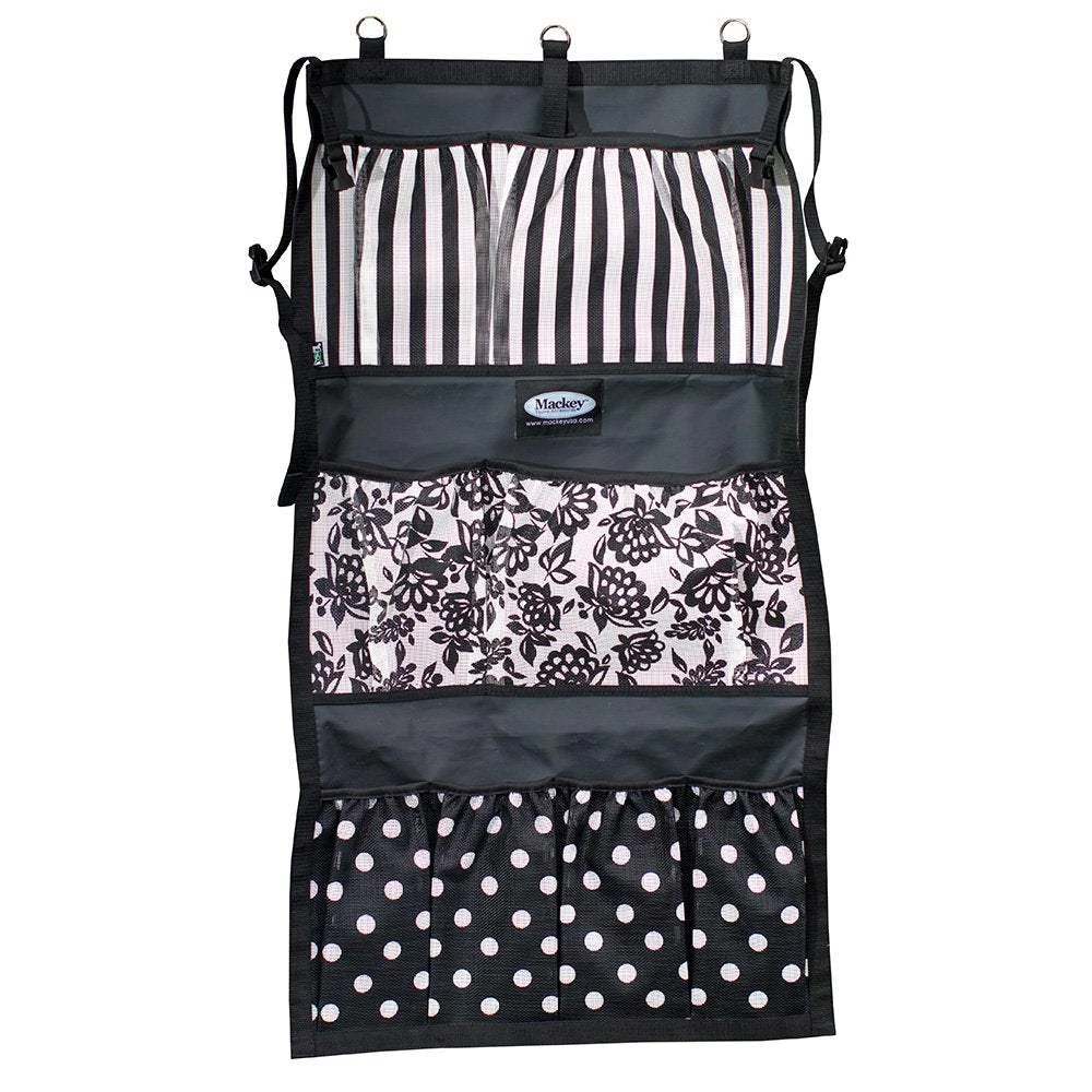 The Mackey Hanging tack organizer hangs from your tack for or trailer(with rings or strap option) Made with PVC coated mesh and nylon webbing for durability and for easy clean up.