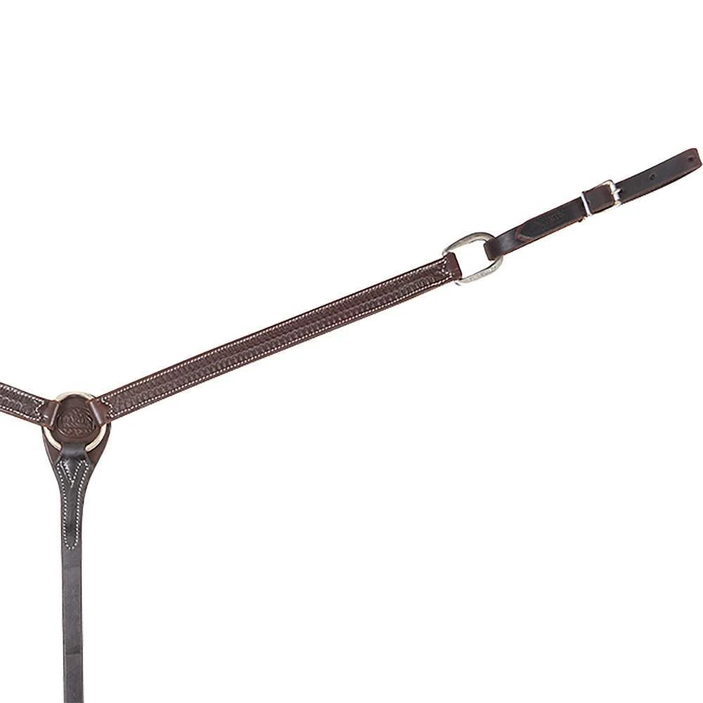 This breast collar is made of chestnut skirting leather with Camo border. It is made with a shorter length to fit colts and smaller horses.