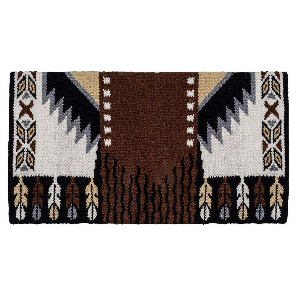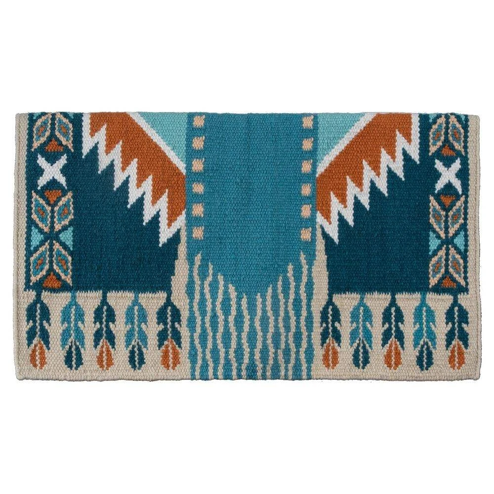 Behind the Reining Glory Design – Honor and communication with our creator was symbolized by decorating bridles and horse masks with feathers. Additionally, the feather symbolized prayer and high power. Feather icons line the bottom sides of the pattern. The repeating parallelograms on the front and the back convey the realization of goals (left slant) and enlightenment (right slant). Together they create a butterfly – the symbol of transformation and dreams coming true. The power of putting a concept or idea into practice is represented by the X symbol. These also line the front and back of the pattern. When saddled with the Reining Glory Good Medicine Saddle Blankets, the horse and rider are united and in communication with each other. This saddle blanket conveys realized dreams and goals with trust built on mutual communication.