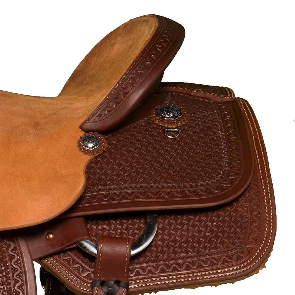 This NRS Competitor Series Team Roper has a 5 year warranty on the rawhide covered wood tree, silver floral berry conchos, tooled leather covered roper stirrups, natural heavy oil leather, cheyenne roll cantle, 7/8 brred windmill tooling, front 7/8 drop rigging, a hard seat, and 90/10 wool blend lining. The seat pocket is constructed to help hold the roper in place and offer better balance effectively giving the roper every advantage.