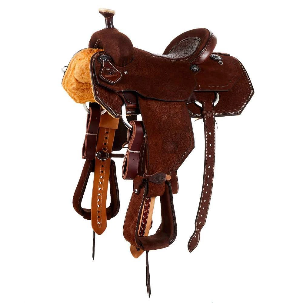 This NRS Competitor Series Team Roping saddle a Rough Out saddle that is rich in its chocolate color, and accentuated with dark brown buckstitching in all the right places. Best of all it has a Red Bullhide inlaid seat that is not only stylish, but comfortable!