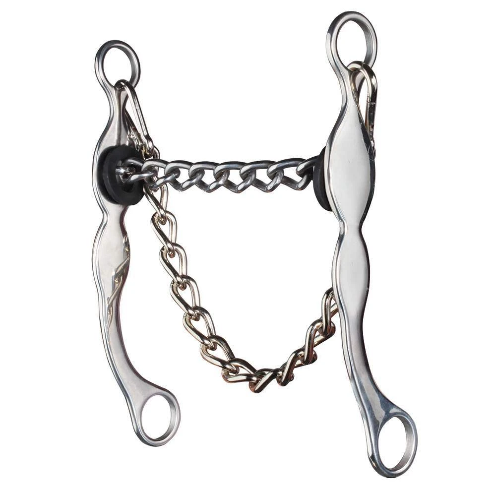 This is a traditional chain bit with a 5 1/8″ mouthpiece. The shank is 7 1/2″ long, which allow for ample leverage. The chain mouthpiece encourages significant bend in the horses body. EQB-900