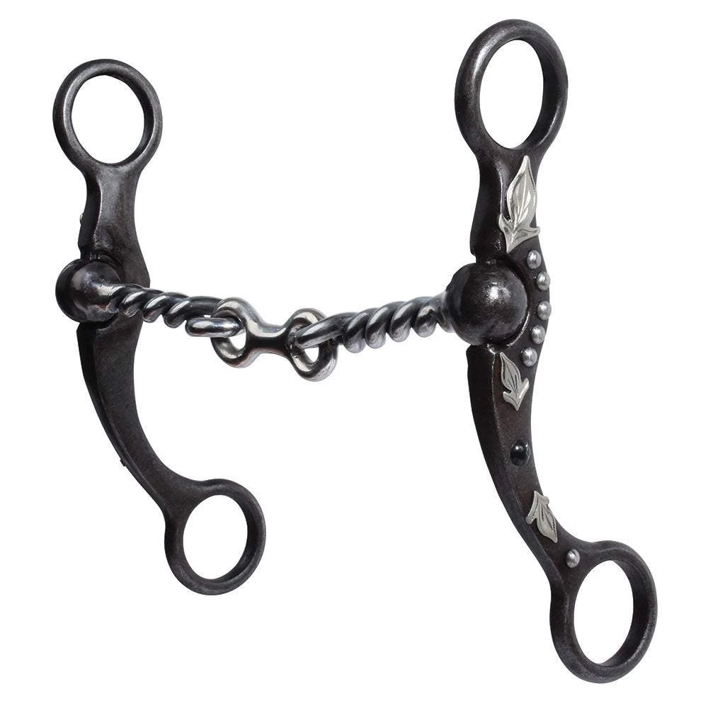This weighted cheek allows for more control and added poll pressure while maintaining clean lateral movement. The cheek pieces features a decorative silver and colored stone design. Twisted wire dogbone mouthpiece.