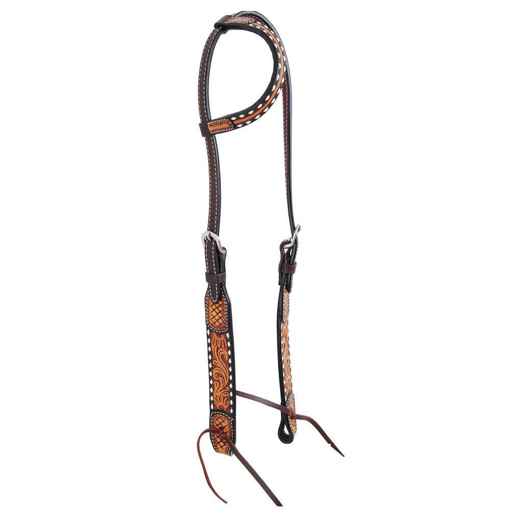 This Rafter T Ranch Co. Single Ear Headstall is a classic. Constructed of premium leather with a beautiful hand-tooled sunflower design accented with a basket stamp tooled leather. White buckstitch on the trim. Bit tie ends and stainless steel hardware.