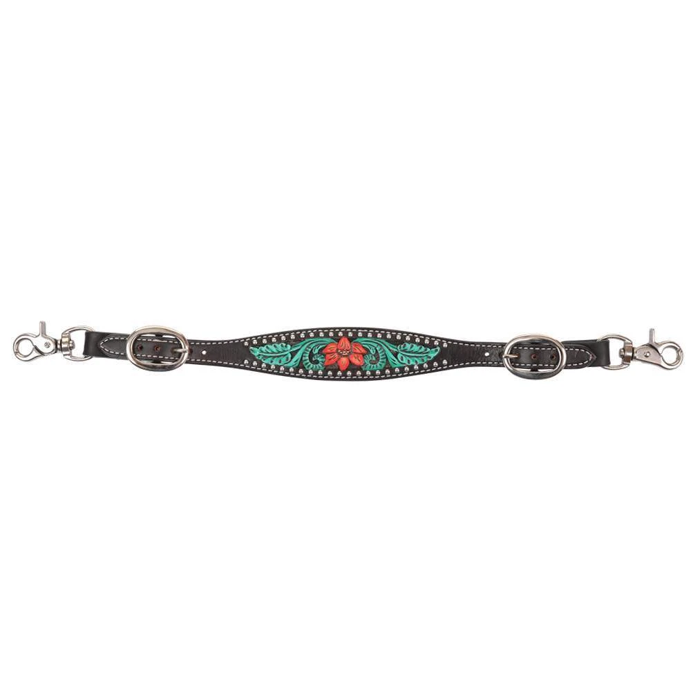 ย This Circle Y Cactus Flower Filigree Wither Strap is the perfect addition to your tack collection. Turn heads with hand tooled turquoise filigree and stained red cactus flowers, accented with silver spots around the trim.