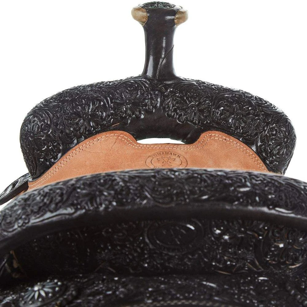 This Tomahawk Team Roper has a fiberglass covered wood tree and a hard seat measuring 14.5 inches. This saddle is made of chocolate leather and features 7/8 breed floral tooling. In addition, it comes with a matching breastcollar for added convenience. The saddle’s gullet measures 6 3/4 inches, and its style number is TMK-MTM-F06-78C.