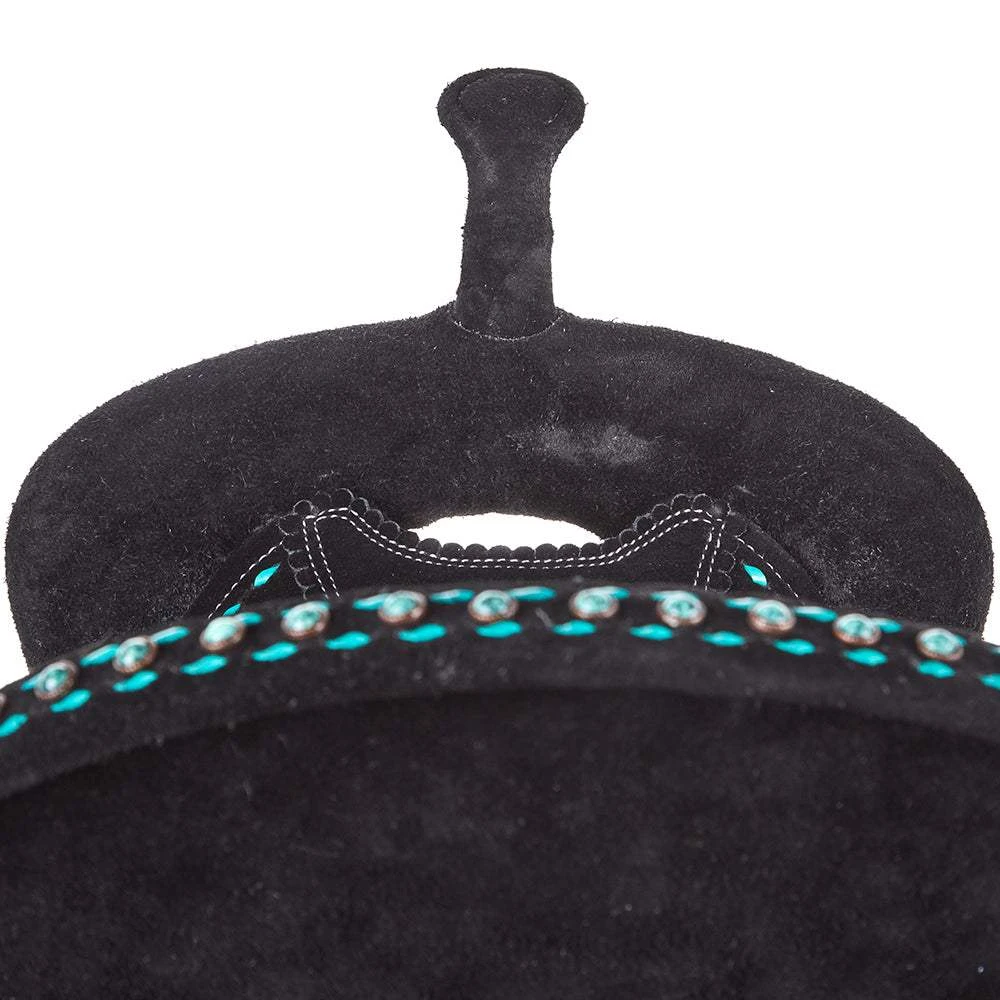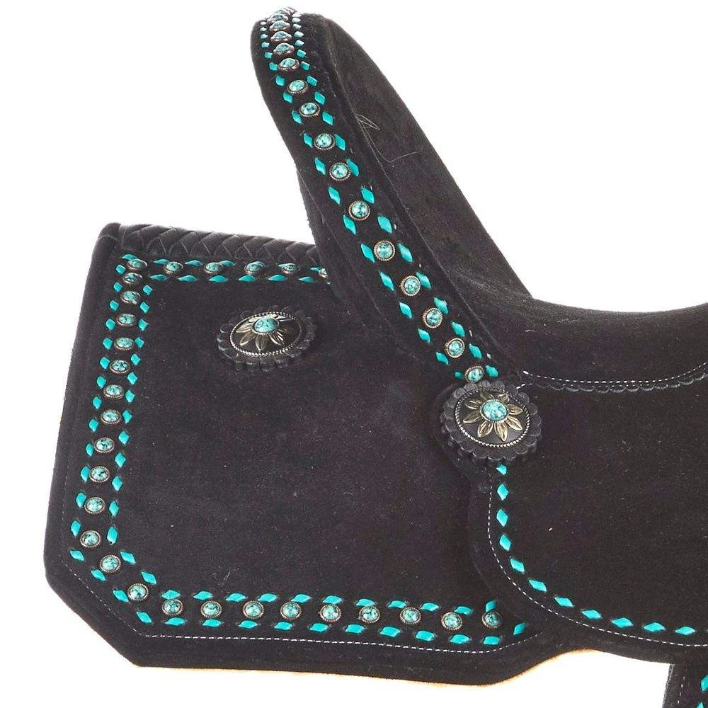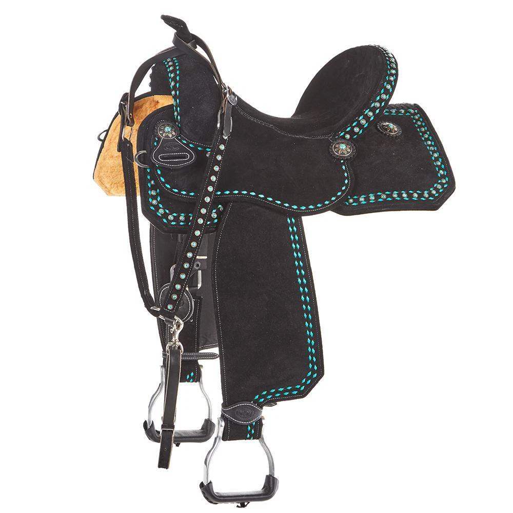 Introducing the Tomahawk Black Roughout 14 Inch Lightweight Barrel Saddle. This Brazilian Light Weight Saddle is designed for superior performance and comfort. Its black roughout leather finish gives it a sleek and modern look. The turquoise buckstitch, accompanied by turquoise patina spots, adds a vibrant touch and complements the saddle’s overall design. Equipped with aluminum stirrups, this saddle ensures durability and reliability during your rides. It also includes a matching breast collar for a coordinated appearance. Weighing under 20 lbs, this saddle is lightweight and easy to handle. It comes with a 10-year tree warranty, guaranteeing its quality and longevity. Product Number: TH-BAL010714T.