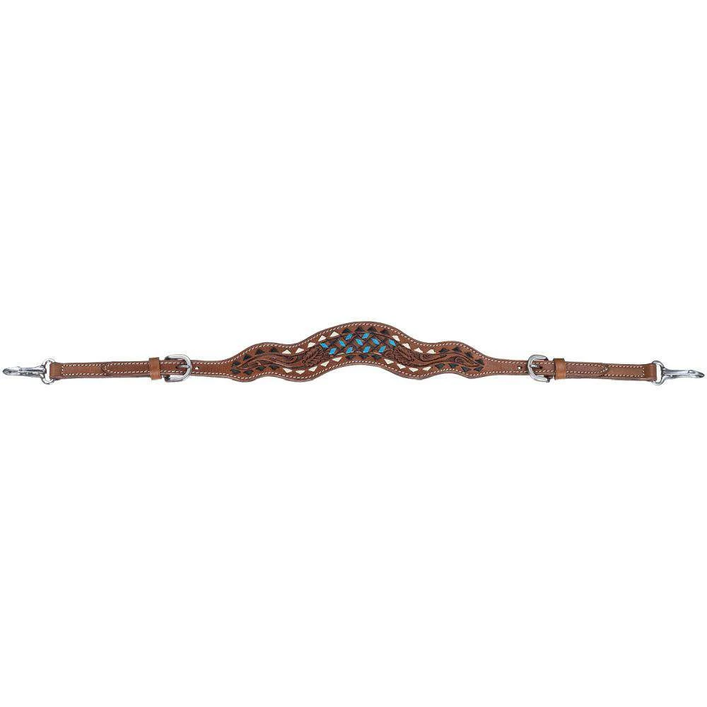 This medium oil wither strap features beautiful hand-tooling and bold tri-color buckstitching of white, black, and turquoise. Designed to easily clip onto the saddle with stainless steel hardware.