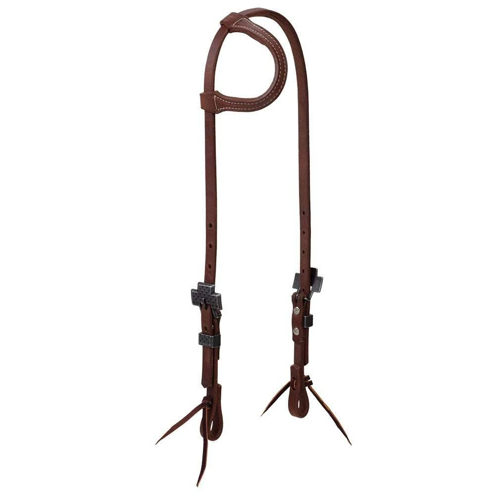 This Weaver Leather headstall is handcrafted from Hermann Oak premium russet harness leather that’s dipped in oil, dressed with saddle butter and hand rubbed for an exceptional feel. Exclusive designer hardware features stainless steel buckles and loop with a light blackening finish and black rasp accents.